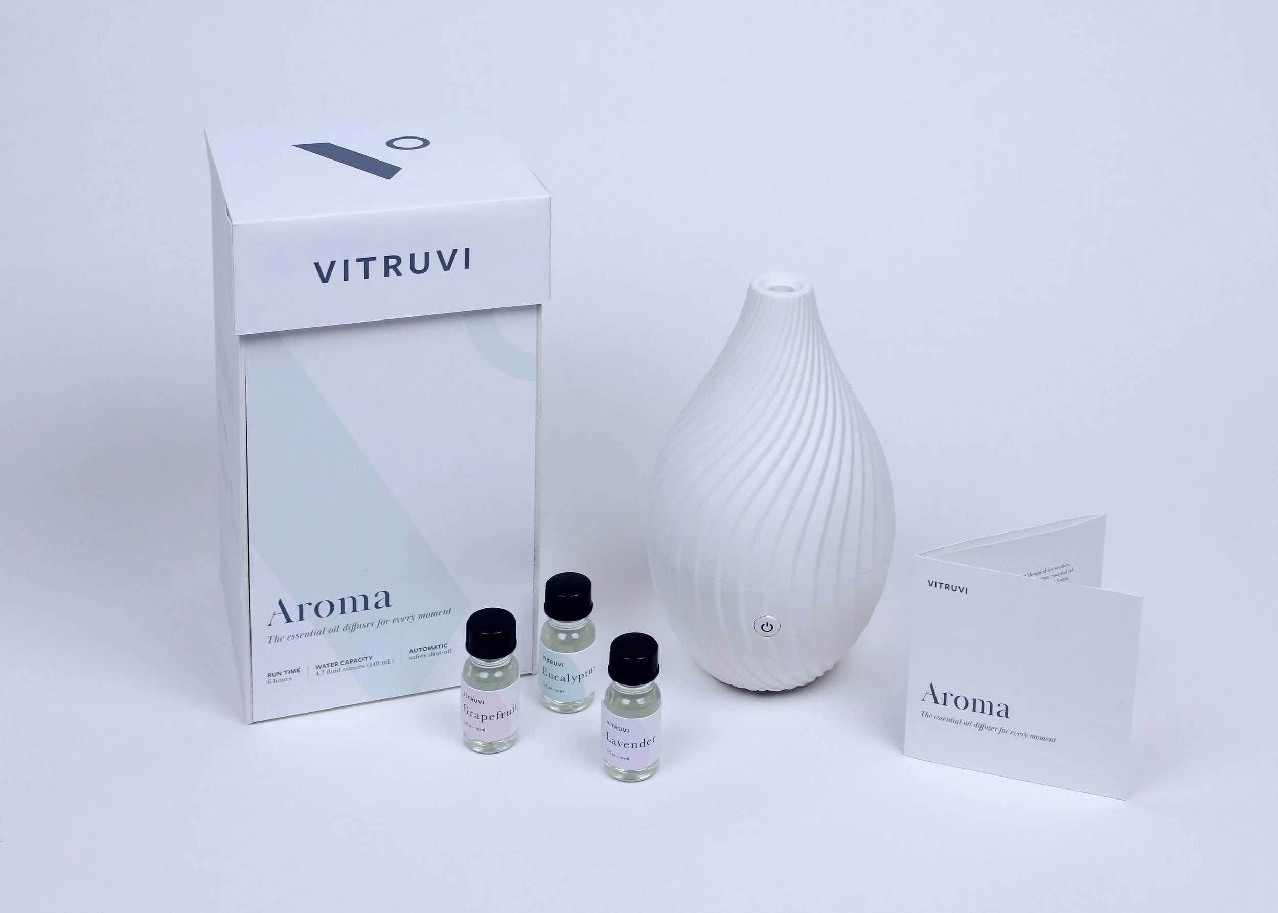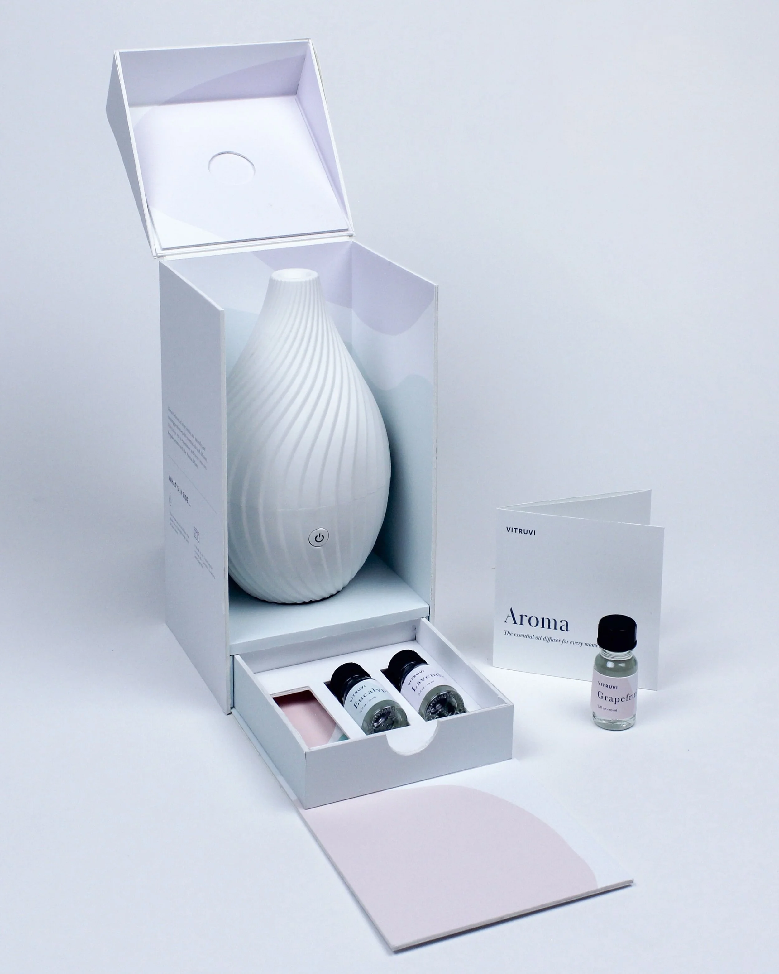 Packaging design for a sophisticated essential oil company, Vitruvi. The Aroma box features Vitruvi’s essential oil diffuser and a set of three oils that blend as well together as they do on their own.