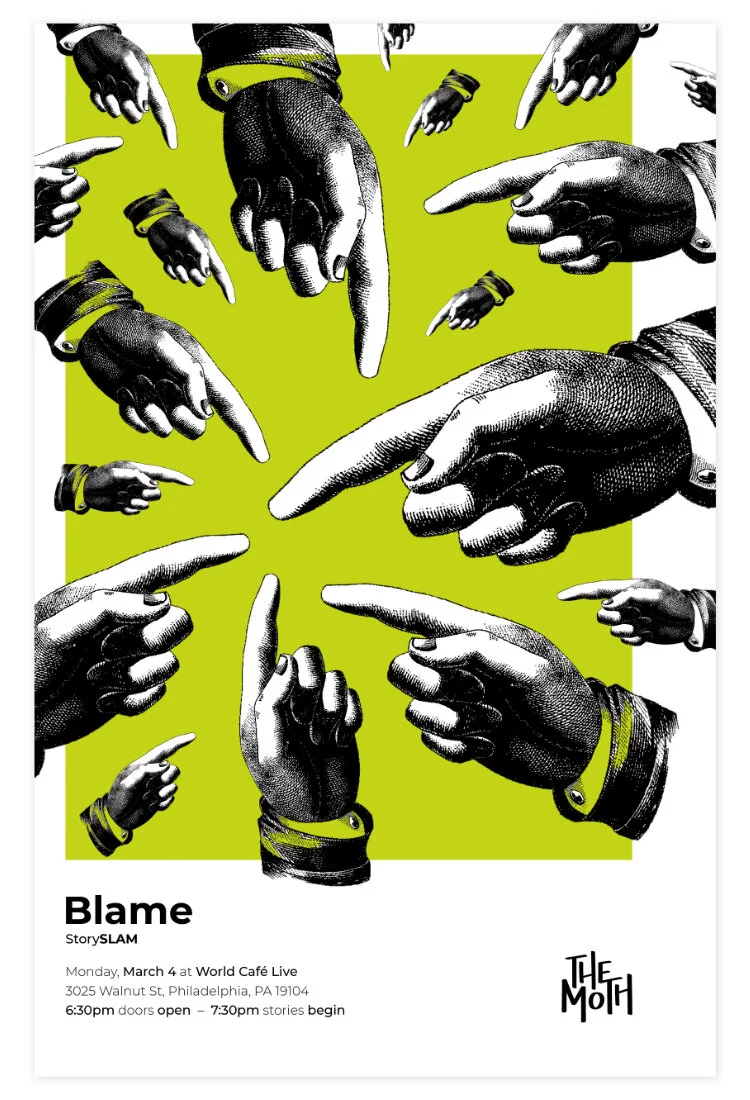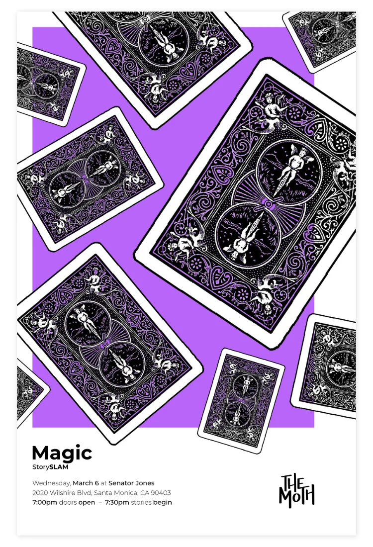 The layout of each poster is consistent, but the images and color vary depending on the event’s theme. The examples below are for event’s with the themes: Blame, Love hurts and Magic.