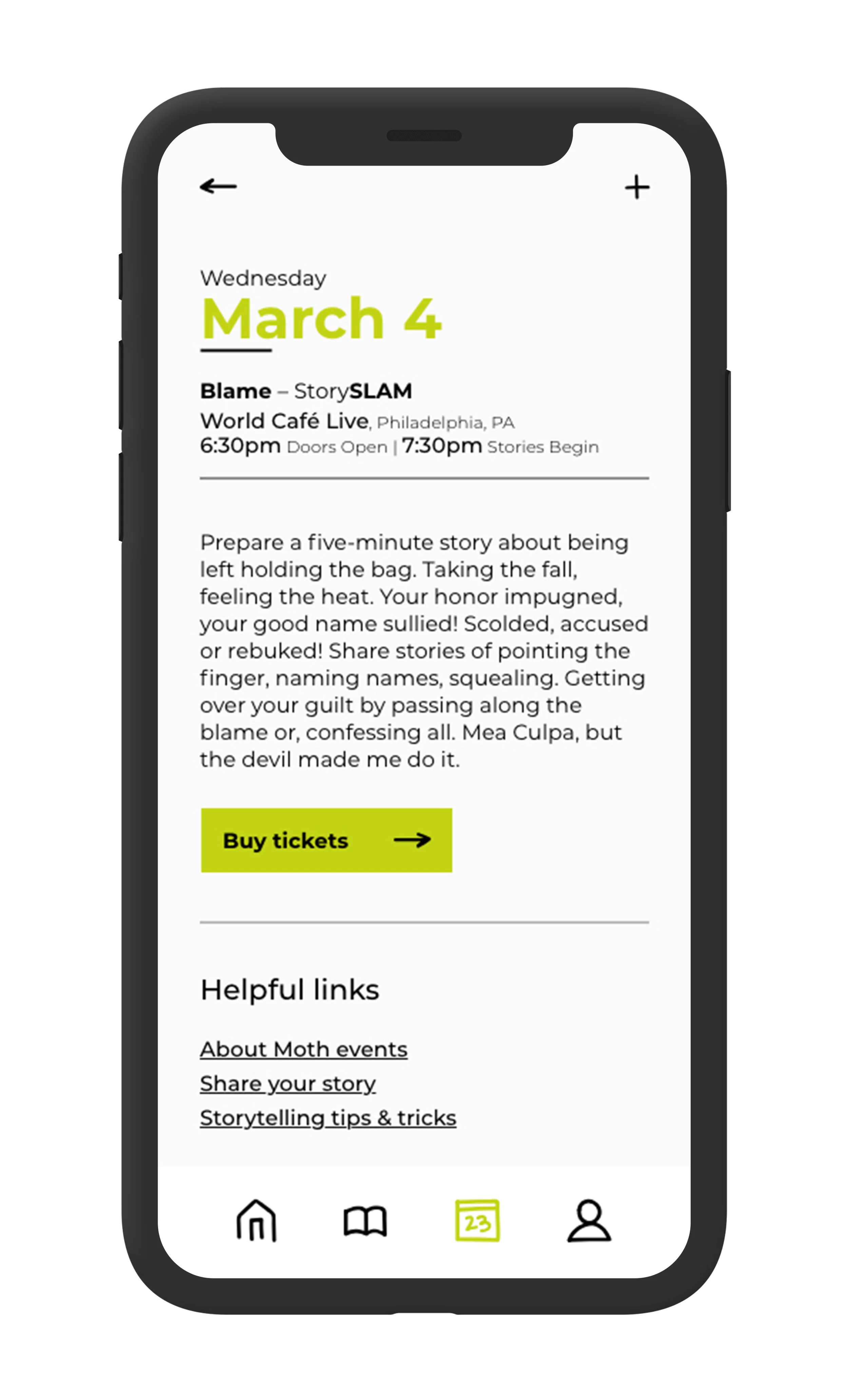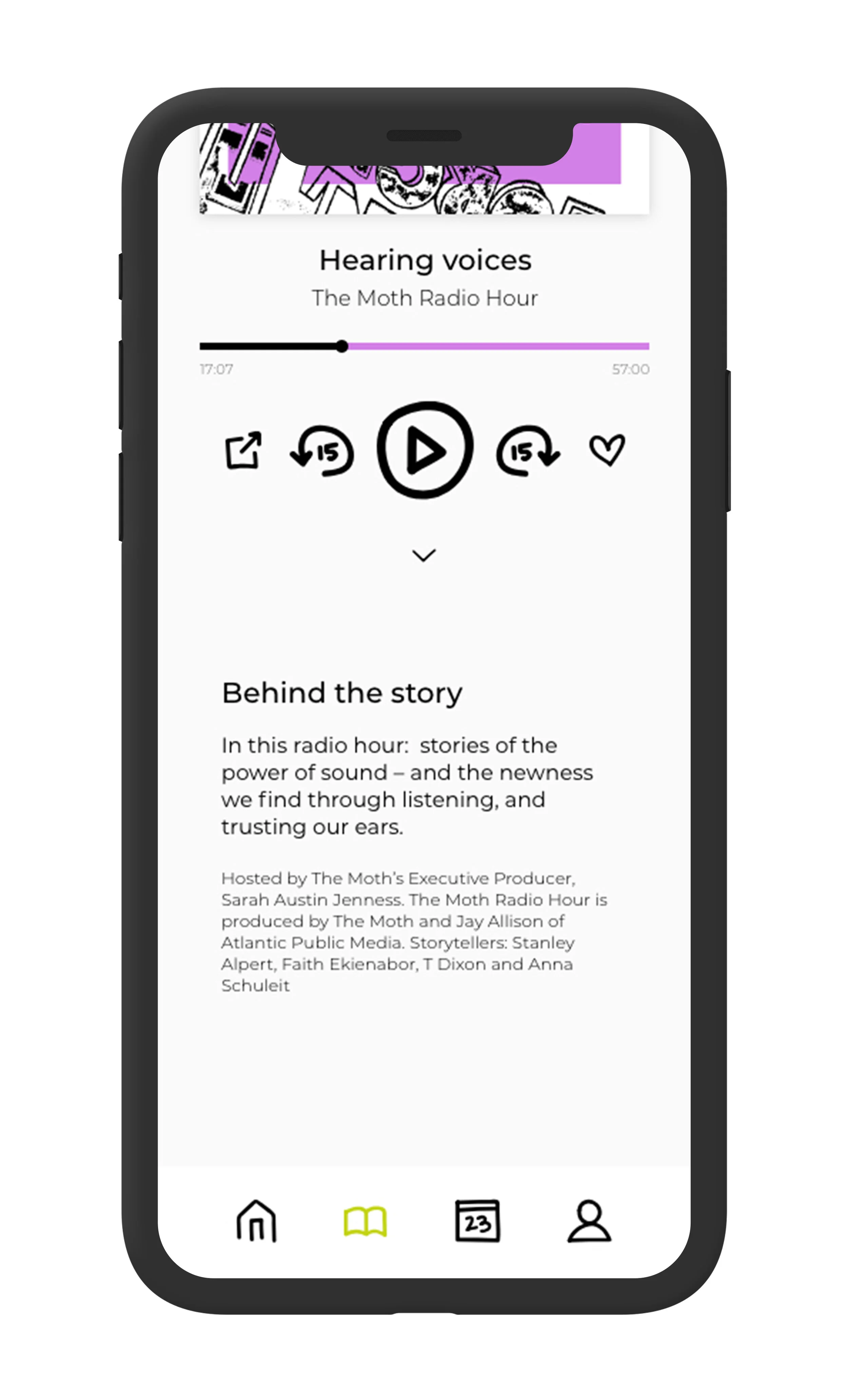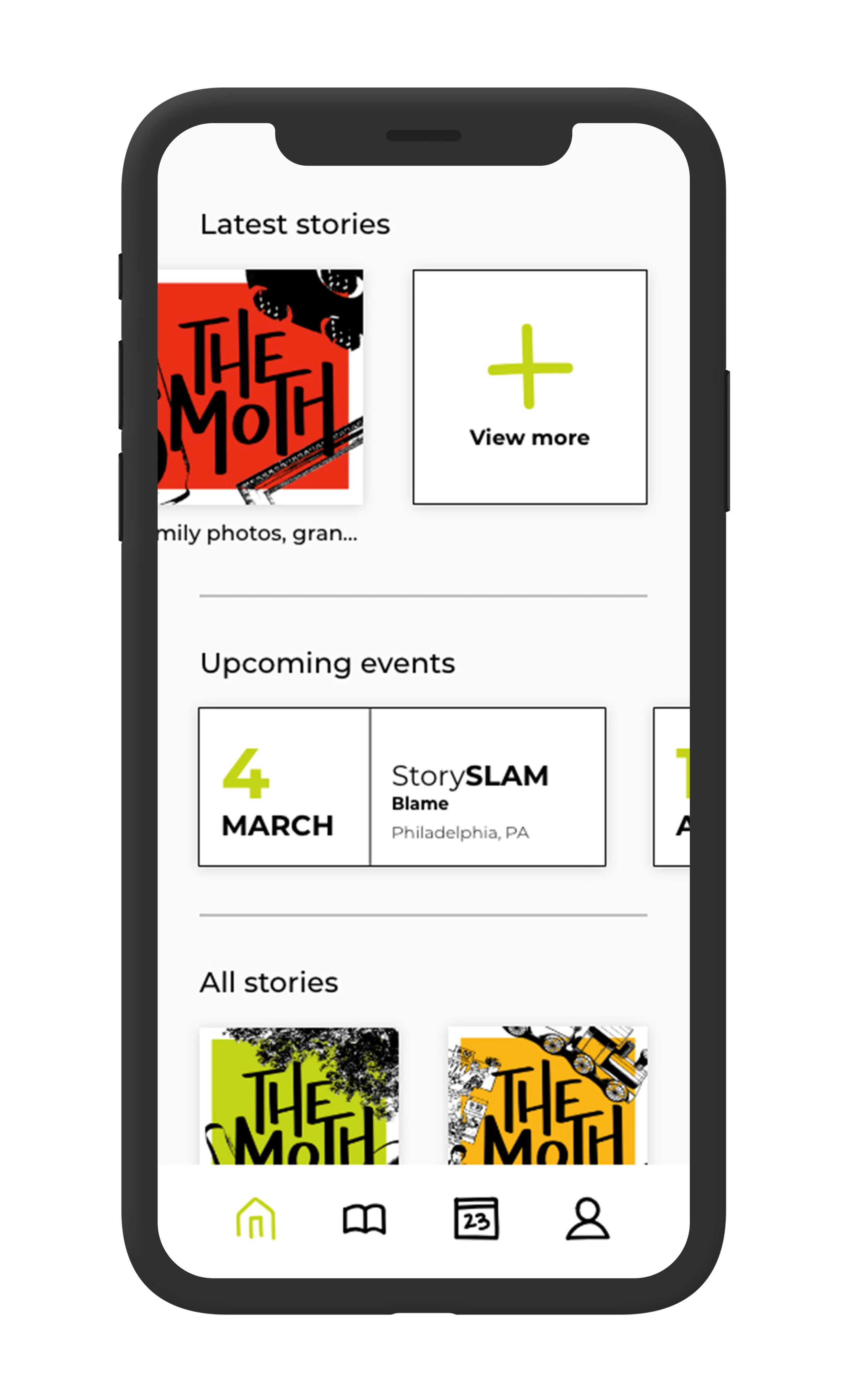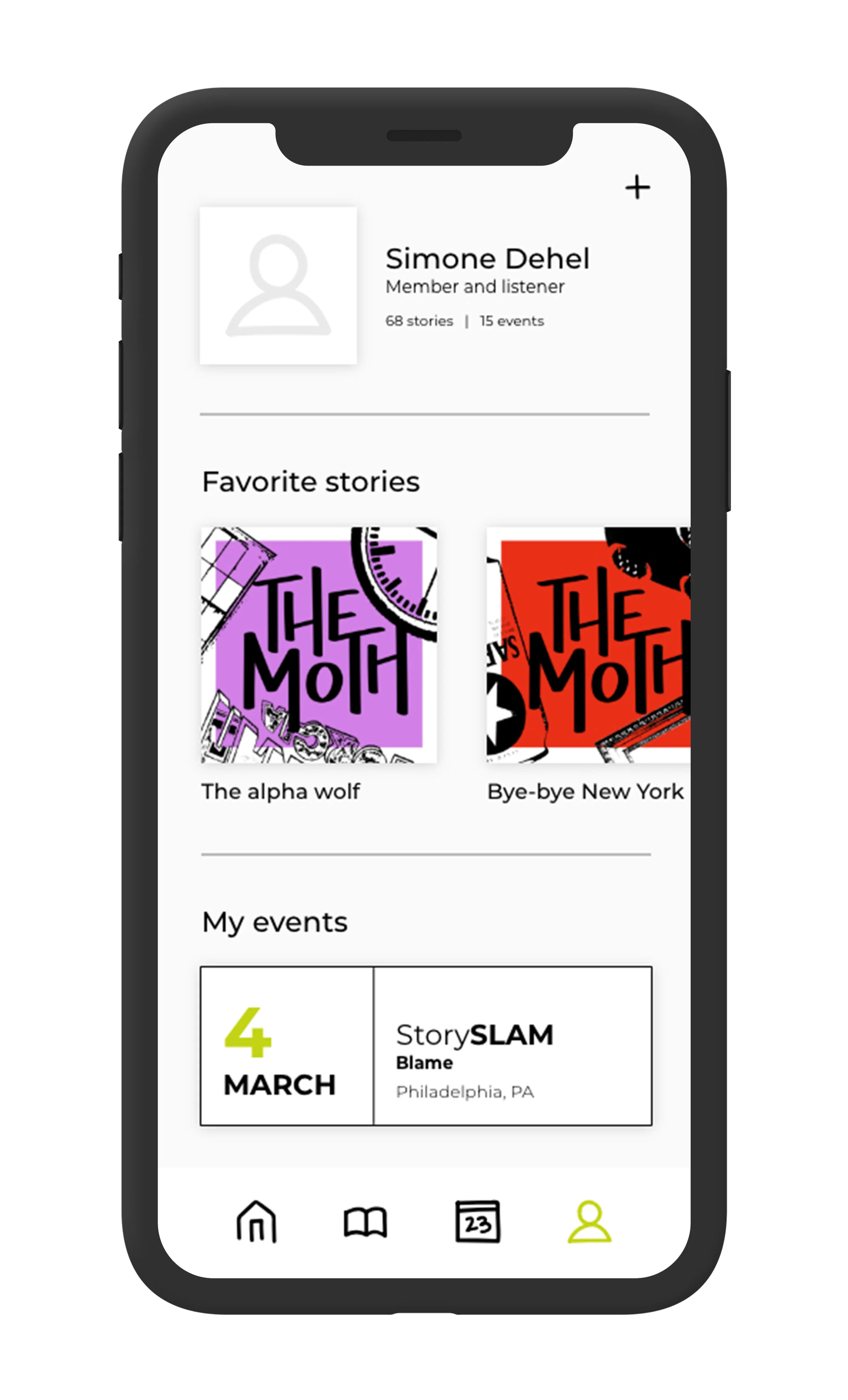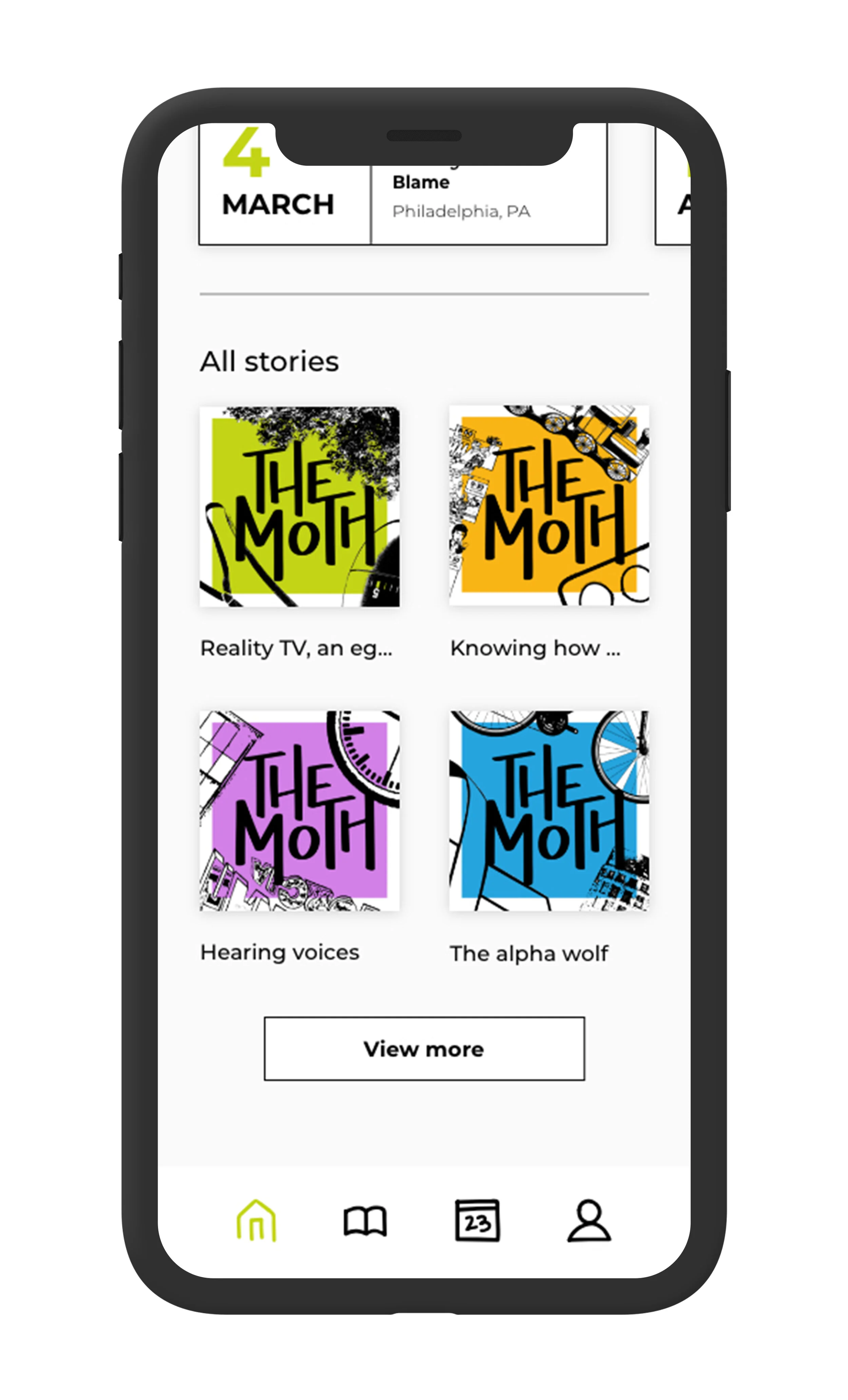 A major goal for this redesign was to create a more cohesive digital experience for dedicated Moth supporters. Unlike The Moth’s preexisting website, this mobile app not only focuses on The Moth’s stories and live events but also drives people to become active listeners and members.