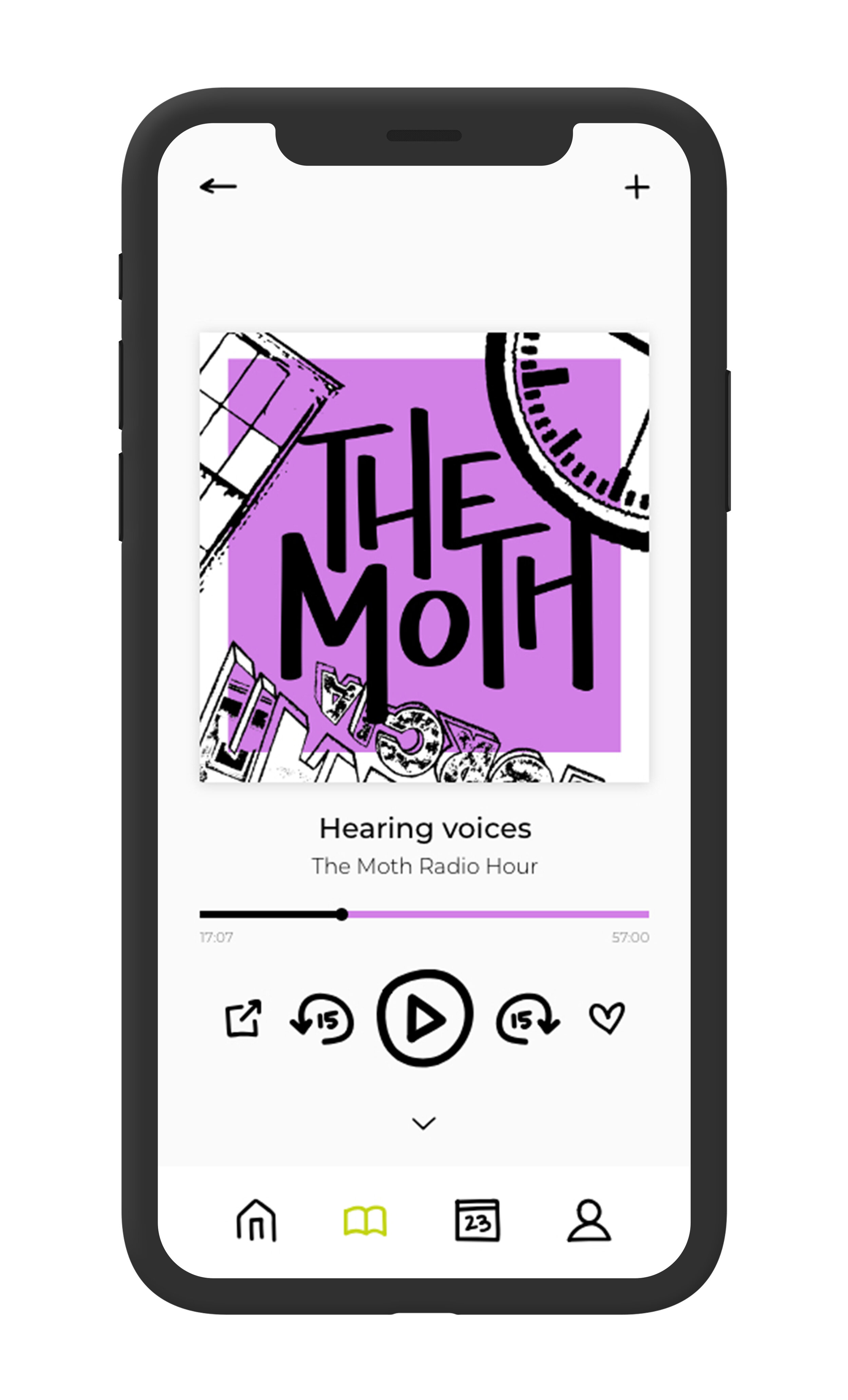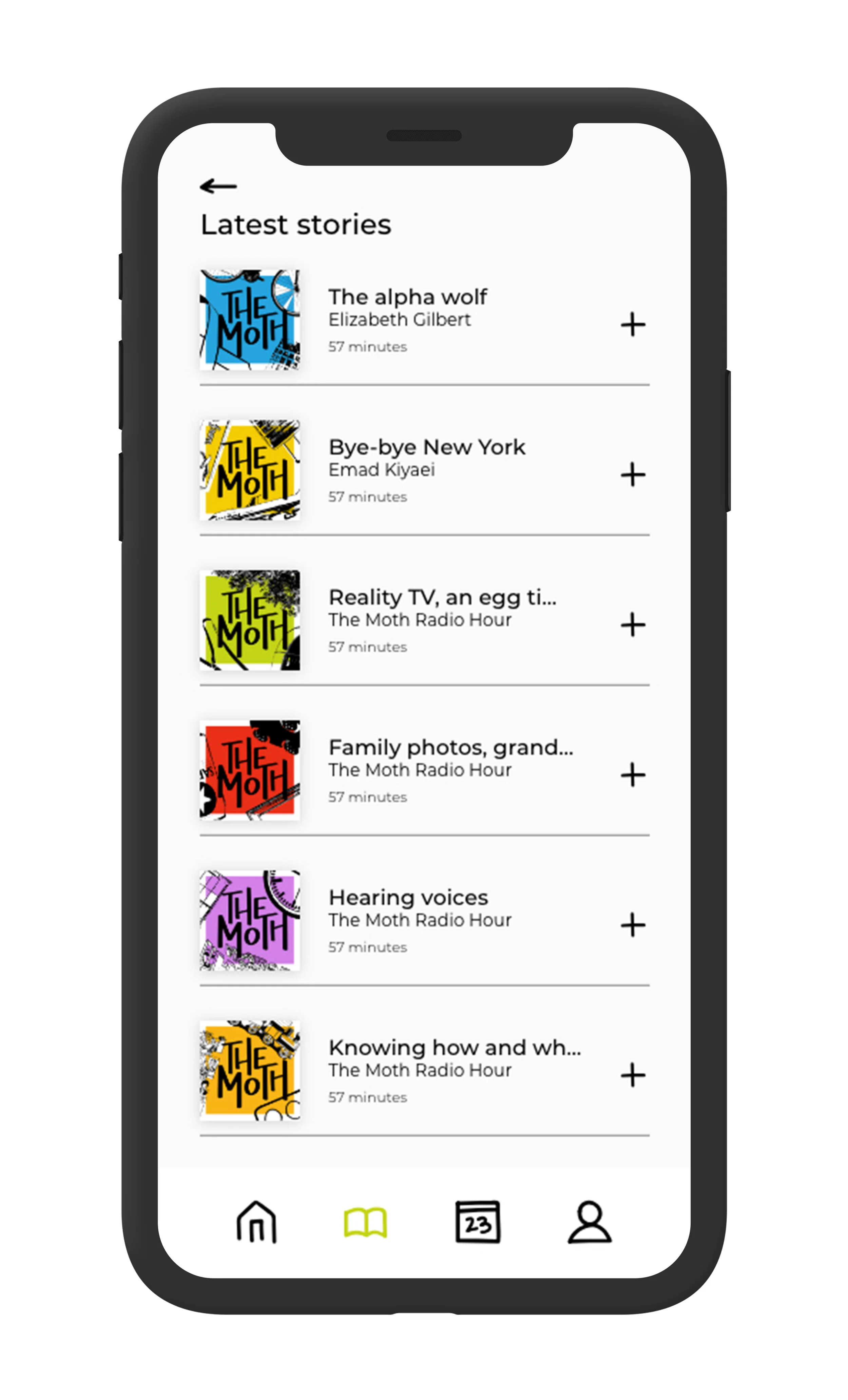The app’s logo, typography, and icons borrow trends from The Moth’s core brand elements. However, the color palette remains minimal to help highlight the story covers throughout the app.